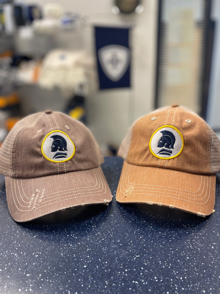 Distressed Style "Trucker" Cap with Embroidered Spartan Head Logo